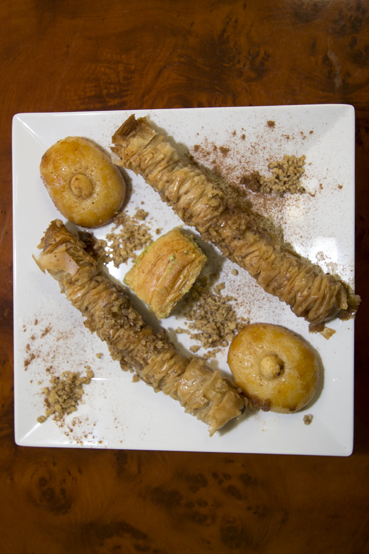 Sweet pastry made of extremely thin sheets of phyllo dough layered with chopped nuts and honey syrup, baked with butter and cut into diamonds.