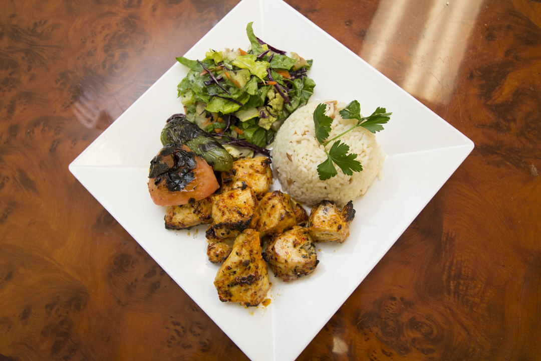Chunks of chicken and seasoned chicken breast on skewers, grilled. Served with rice and salad.